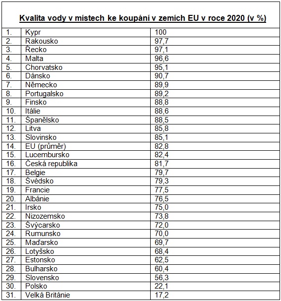Na dalších místech za Německem je Portugalsko (89,2%), Finsko (88,8%), Itálie (88,6%), Španělsko (88,5%). Zajímavé je, že např. mimořádně bohaté Lucembursko má zhruba stejnou kvalitu vody ke koupání (82,4%) jako Česko. Průměr sledovaných zemí EU, vč. Velké Británie je 82,8%.