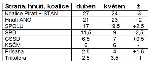 Na druhém místě s posilujícími preferencemi na úrovni 23% zůstává hnutí ANO, které posílilo oproti dubnu o 2%. Myslím, že to nemusí být poslední číslo. Předpokládám, že Babišovo hnutí v krátké době představí svůj program a také zahájí několik týdnů před volbami masivní volební kampaň.