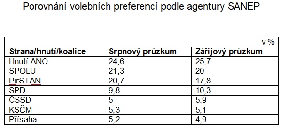 Podle průzkumu agentury SANEP by obě pravostředové předvolební koalice v souhrnu atakovaly hranici necelých dvou pětin hlasů voličů. Konkrétně konzervativní koalice SPOLU 20% a 17,8% Piráti se STAN.