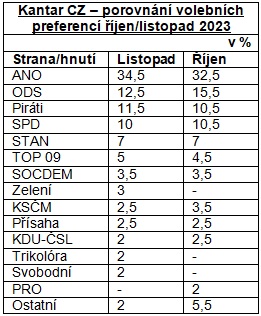 Z porovnání volebních preferencí zpracovaných stejnou agenturou v měsíci říjnu vyplývá další posílení trendu podpory hnutí ANO. V případě agentury Kantar CZ dochází ke zvýšení preferencí z 32,5% na 34,5%. Dá se tedy říci, že agentura Kantar predikuje podobnou výši volebních preferencí a obdobnou dynamiku vývoje preferencí hnutí ANO jako další renomované agentury pro výzkum veřejného mínění.