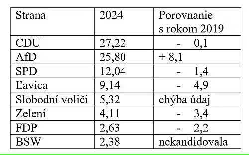Z 980 kresiel získali CDU 270, AfD 255, SPD 107, Ľavica 91, Slobodní voliči 53, Zelení 39, FDP 26 a BSW 19. Všetky údaje sú len predbežné.